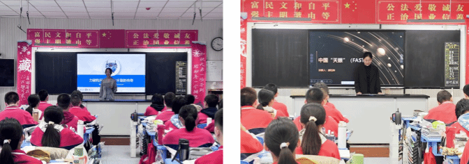 活动中,两位志愿者充分发挥专业优势,用通俗易懂的语言为高一年级的同学带来了一场精彩纷呈的科普盛宴。吴极鑫聚焦元代钧窑“小宋自造”香炉,解锁传统工艺中蕴藏的科学智慧,让同学们感受中华优秀传统文化里的匠心与科学思维;郝钰琳以中国天眼 FAST为主题,讲述现代天文科技的探索历程与非凡成就,带领同学们遥望浩瀚宇宙,激发对太空探索的好奇与向往。